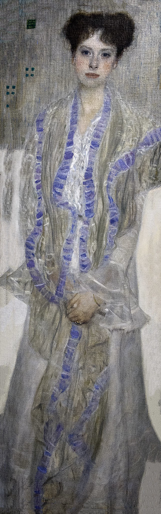 In an essay on de Meyer, Anne Ehrenkranz suggests that Baker was one of the numerous women photographed by the artist who were starting to experience the freedom and sexuality of a new and uneasy age; and in portraying them he adopted a similar approach to the artist Gustav Klimt of emphasizing the psychological condition, and often with a distinctive linear style. There is a definite similarity between this image and the many full-length paintings executed by Klimt during the early twentieth century. Portraits such as those of Gertrud Loew (below) and Emilie Flöge, both from 1902, are prime examples of this. Female sitters, often with signs of inner turmoil or struggle apparent in their faces, are framed within elegant settings or reflective backdrops. With a familiarity of Klimt’s work, it’s very likely de Meyer would have been thinking of elements from these paintings when capturing the long, slimline dress of Josephine Baker.